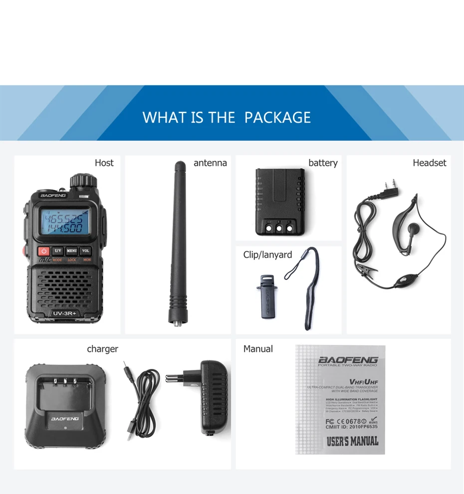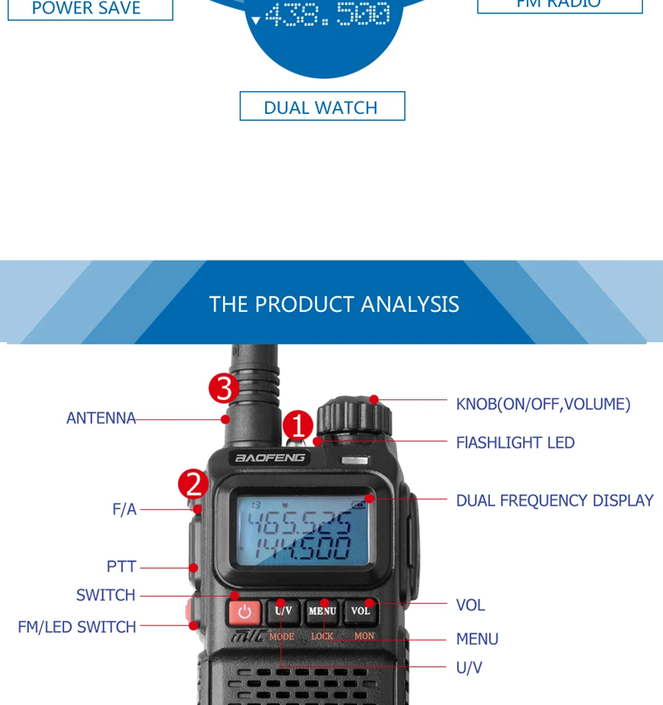 This is BaoFeng Plus dual band radio. Mini size. Latest version with , S-meter and dual display and dual band antenna. It comes with the repeater sound response feature. When the feature is activated, the handheld transceiver will hear the sound from the repeater. It is a micro-miniature multiband FM transceiver with extensive receive frequency coverage, providing local-area two-way amateur communications along with unmatched monitoring capability.