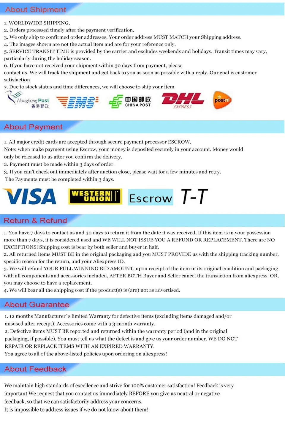 If the product you receive is not as described or low quality, the seller promises that you may return it before order completion (when you click "Confirm Order Received" or exceed confirmation timeframe) and receive a full refund. The return shipping fee will be paid by you. Or, you can choose to keep the product and agree the refund amount directly with the seller.N.B.: If the seller provides the "Longer Protection" service on this product, you may ask for refund up to 15 days after order completion.