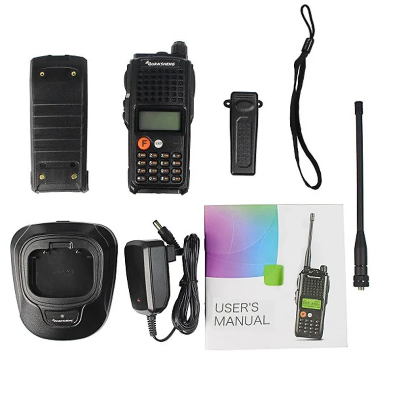 1. Same frequency / different frequency2. PC Program Function3. Initialization4. Channel step 5k/10k/12.5k/25k5. CTCSS/DCS function6. Voice prompt7. Input Frequency directly by keypad8. Display Channel+ Frequency mode9. Monitor and scan function10. Switch power between "HI" and "LOW”11. Auto battery saving function, extend the using time of battery.12. Low power alarm, when the power is low,it sendsthe sound signal to alarm you change the battery.13. Communication range: As usual it’s 5kilometers, but sometimes it is affected by environment.14. Earphone / microphone / auto charger jack,convenient for answering and charging. 15. Scanning function: frequency and channel scan16. Memory clear function Specitications:Frequency range: VHF: 136-174MHz UHF: 400-470MHz UHF: 450-490MHzRated voltage: DC 7.2VMemory channel: 100Frequency sensitivity: ±5PPMOutput power: H≥10W M≥1W Remanent radiation: <7μWIntermodulation distortion: ≥60dBAdjacent channel Selectivity:≥65dBBlocking: ≥85dBSpurious rejection:≥65dB Package Contains:5 x Original walkie talkie QUANSHENG TG-K10AT5 x Charger EU/US5 x Adapter5 x Antenna5 x Belt clip5 x User manualReturn Policy