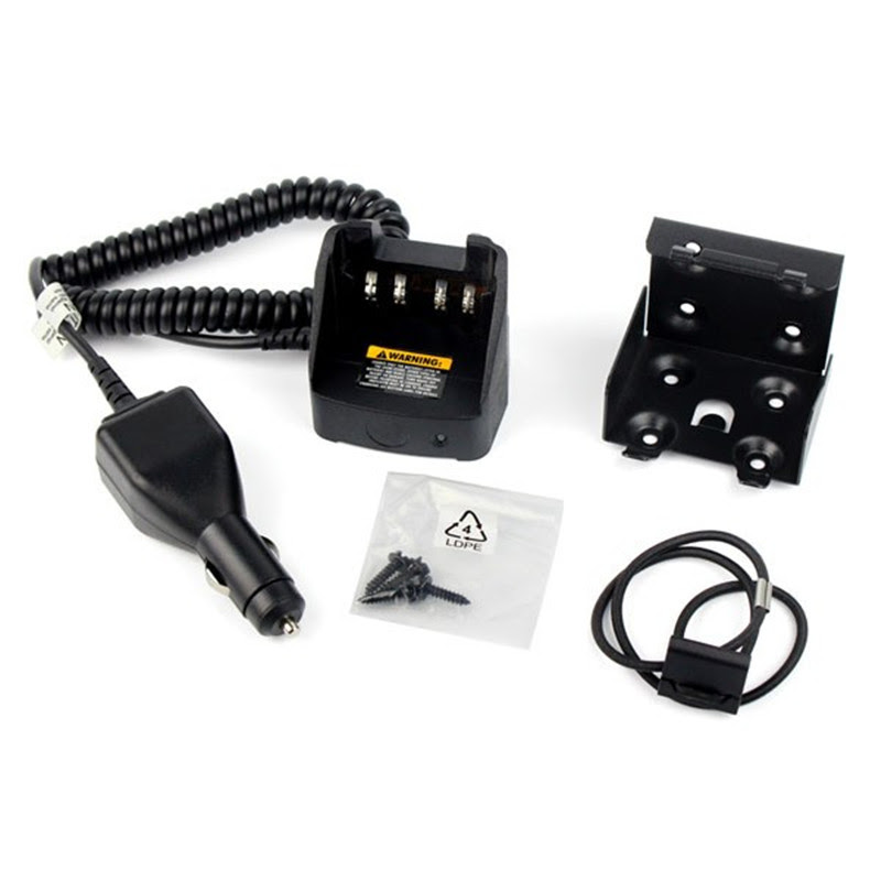 Its small compact design allows the radio to be used while rapid charging in the charger base. Unit includes a voltage regulated vehicular charger adapter, custom charger base, mounting bracket and coil cord and plugs directly into the vehicles cigarette lighter adapter